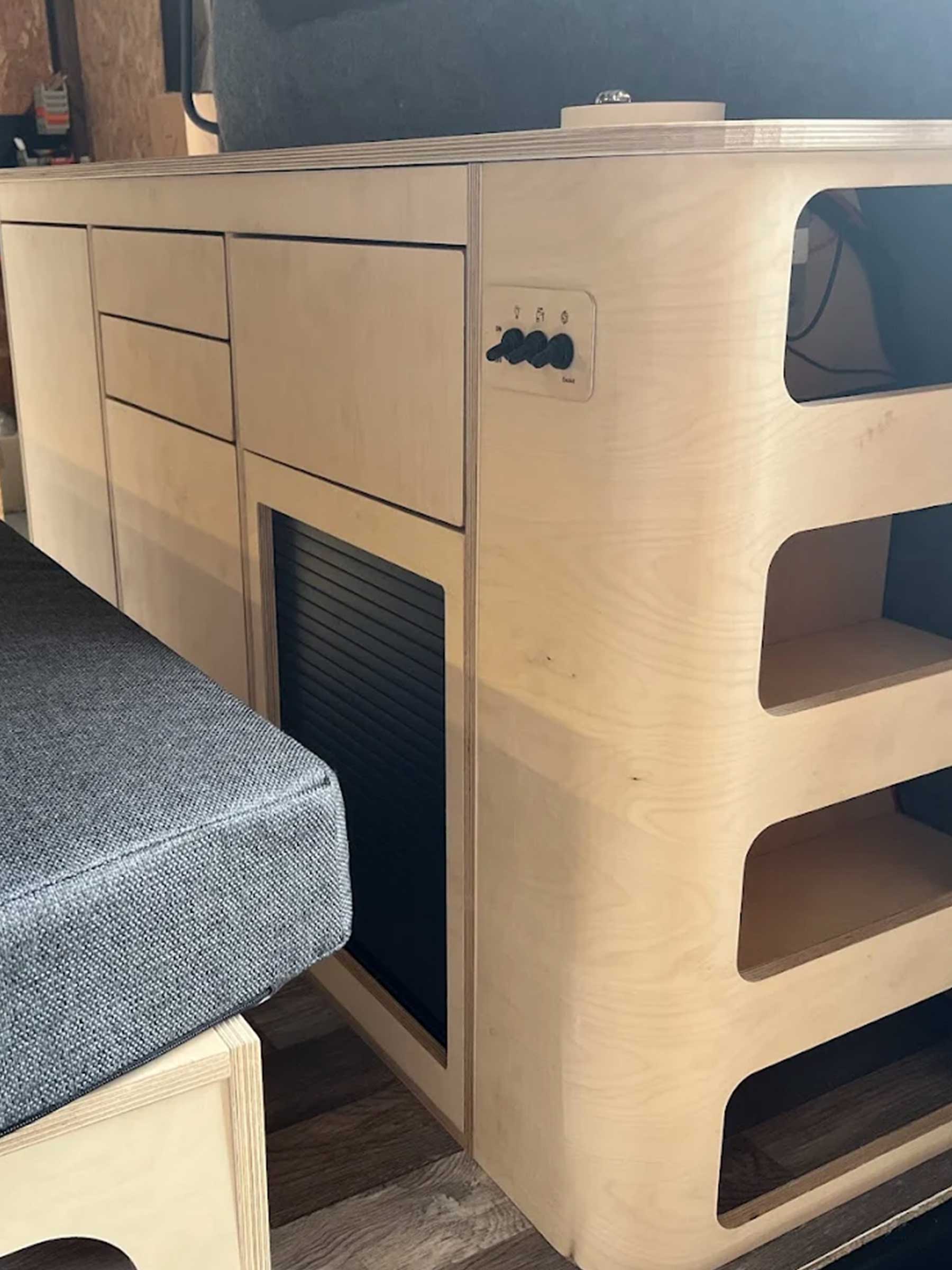 Derrière les sièges avant, nous avons intégré un meuble transversal bas, plaqué contre la cloison de séparation. Il apporte un espace de rangement supplémentaire sans gêner l’accès ou la visibilité. Il peut accueillir des accessoires essentiels : réserve d’eau, batterie portable, vaisselle, équipements outdoor, etc.