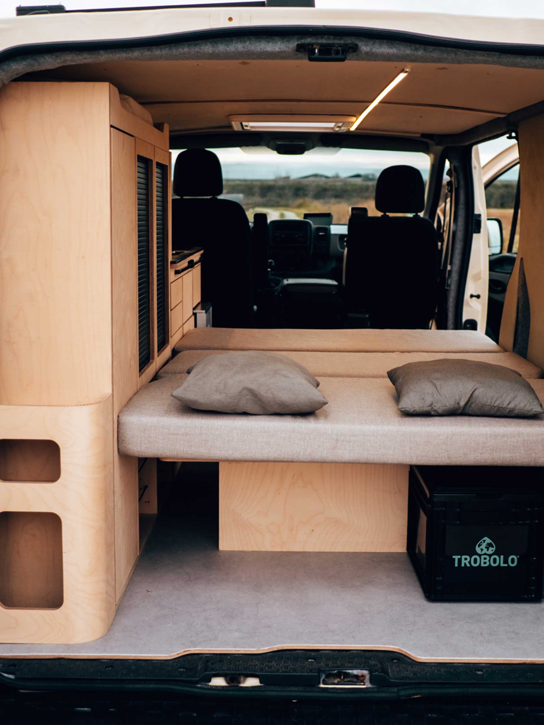 Chaque kit Exokit peut être personnalisé selon les envies des voyageurs : choix de la finition, organisation des rangements, intégration d’accessoires. Dans ce Trafic, l’ajout de matériaux recyclés et l’éclairage LED intégré créent une ambiance moderne et accueillante. C’est un exemple concret de la modularité qu’offre Exokit en partenariat avec des ateliers spécialisés comme Fornomad.
